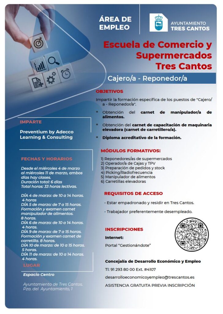 El objetivo principal es capacitar a los participantes en las funciones propias de los comercios y grandes superficies, mejorando su empleabilidad mediante una formación práctica y especializada. El programa contempla, además, la obtención del carnet de manipulador de alimentos, el carnet de capacitación de maquinaria elevadora –carretillero– y un diploma acreditativo de la formación.