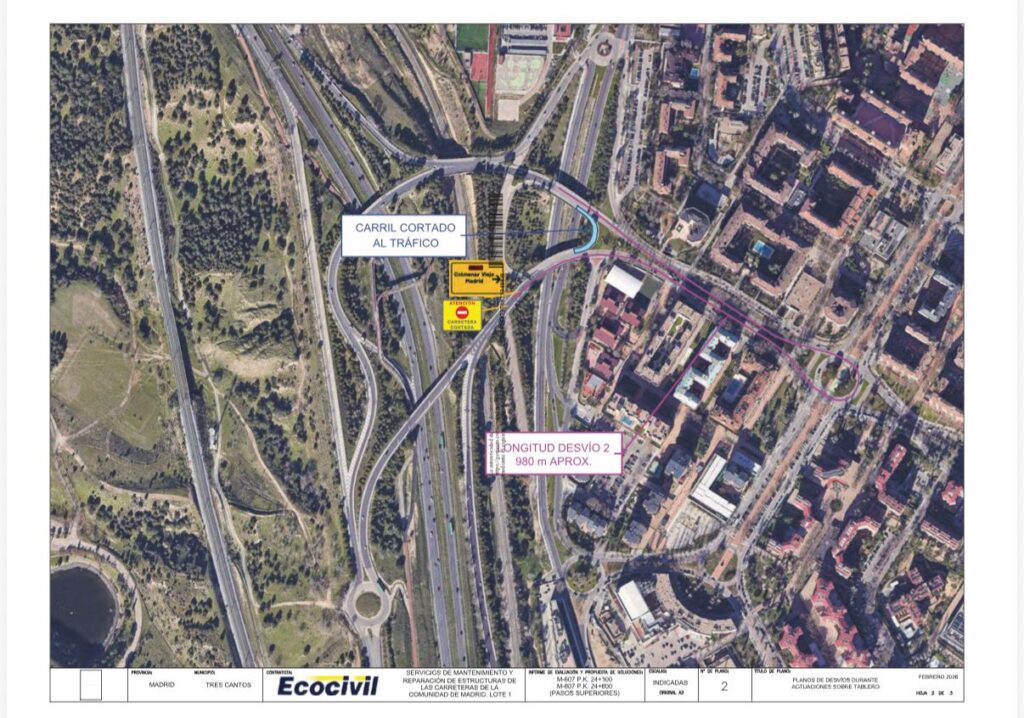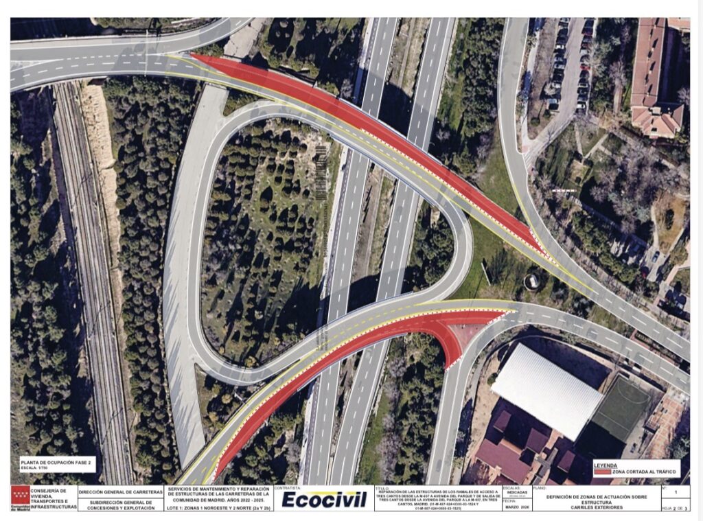La Dirección General de Carreteras de la Comunidad de Madrid iniciará el lunes 6 de abril los trabajos de rehabilitación del tablero de las estructuras que conectan la M‑607 con la Avenida del Parque, tanto en el ramal de entrada como en el de salida de Tres Cantos en la salida 24. Estas actuaciones dan continuidad a los trabajos que ya se están ejecutando en la parte inferior del puente y que han sido coordinados con las concejalías de Movilidad y de Seguridad para reducir al mínimo su impacto en el tráfico del municipio.