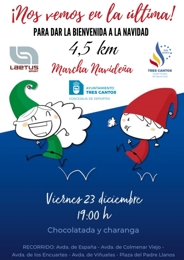 Tres Cantos despedirá el año con una Marcha Familiar de 4,5 km denominada ¡Nos vemos en la última! Será el viernes 23 de diciembre. Una cita para las familias de la ciudad, con salida en la Avda. de España, a partir de las 19:00 horas, cuyo recorrido pasará por Avda. de España – Avda. de Colmenar Viejo – Avda. de los Encuartes – Avda. de Viñuelas, para terminar en la Plaza del Padre Llanos.