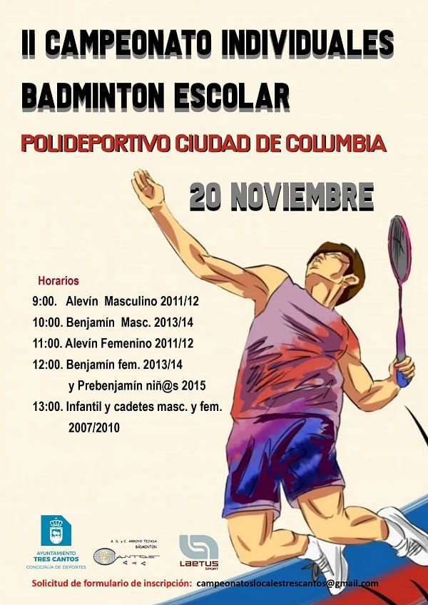 La Agrupación Arroyo de Tejada en colaboración con Deportes del Ayuntamiento de Tres Cantos convoca el 2º Campeonato de Bádminton escolar con los horarios siguientes: