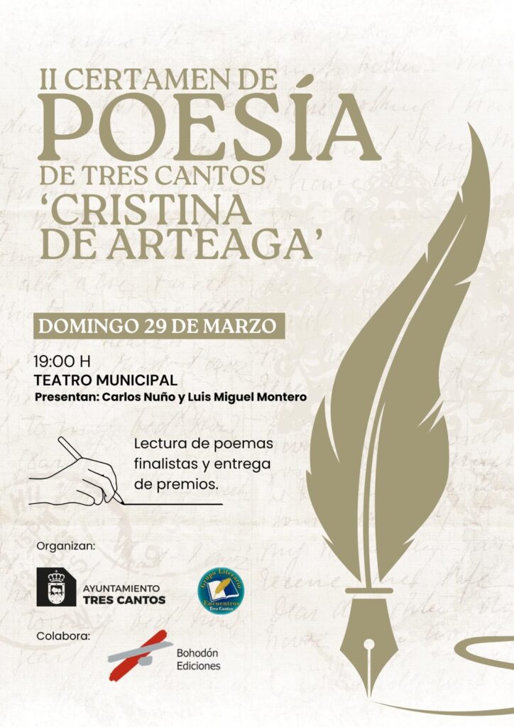 El Ayuntamiento de Tres Cantos, a través de la Concejalía de Cultura, celebrará este domingo 29 de marzo, a las 19:00 horas, el II Certamen de Poesía de Tres Cantos ‘Cristina de Arteaga’, que tendrá lugar en el Teatro Municipal del Centro Cultural Adolfo Suárez.