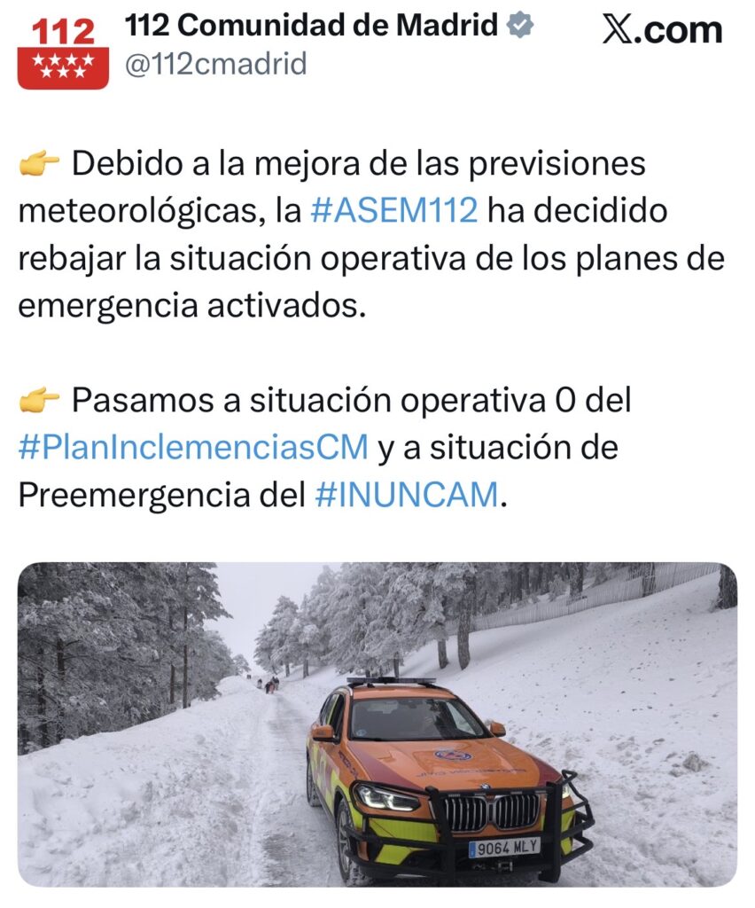El Ayuntamiento mantiene la vigilancia ante la mejora de las condiciones climatológicas durante la tarde del sábado, tras la desactivación del aviso naranja por vientos y nevadas en la región, así como el paso de la Situación Operativa 1 a 0 por parte del Plan de Inclemencias Invernales de la Comunidad de Madrid. No obstante, según indican fuentes del Ejecutivo Regional, “se mantiene la situación de preemergencia del Plan Especial de Protección Civil ante el riesgo de inundaciones (INUNCAM)».