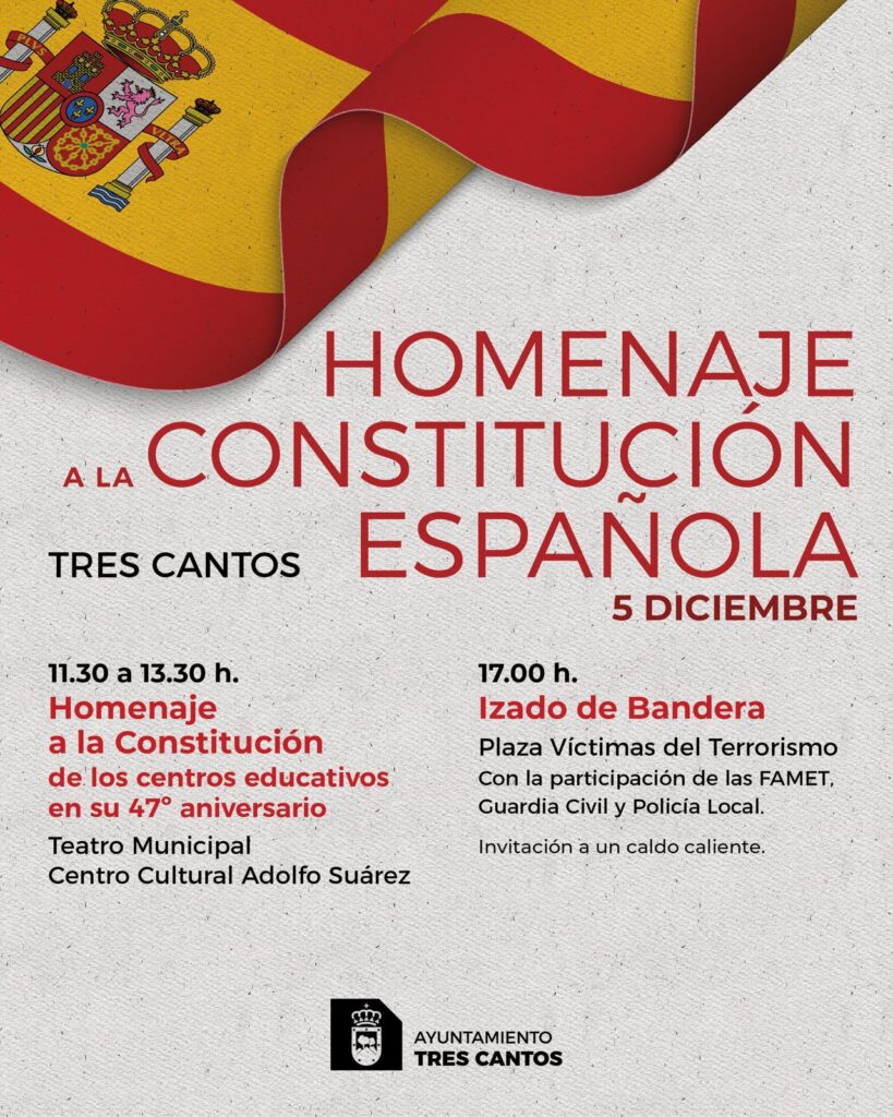 A partir de las 11:30 de la mañana, diecinueve centros educativos de Tres Cantos protagonizarán un acto en el Teatro Municipal de Tres Cantos. Bajo el lema “Todos unidos con la Constitución” los estudiantes participarán en una ceremonia de homenaje a través de la lectura de artículos seleccionados de la Carta Magna, acompañados por miembros de diferentes sectores profesionales y representantes de los partidos políticos. La ceremonia comenzará con una introducción de la concejal de Educación, Marisa Peña, quien explicará a los asistentes el origen y sentido de los principales símbolos de España: la bandera, el himno y el escudo. Al finalizar el acto, los participantes serán obsequiados con chocolate con churros y se les entregará una pulsera conmemorativa.